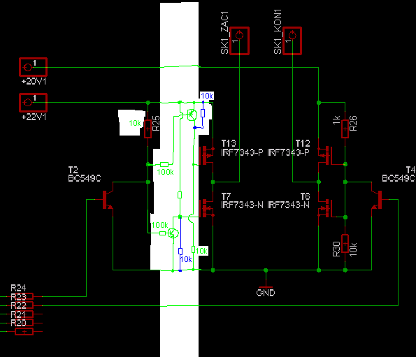 //edit: aaa, sakra, ten vrchny PNP nikdy nerozopne lebo spodny NPN stahuje napatie cez ten 100k a tranzistor na zem. Takze treba zvysit tie 100k na bazach aspon na 330k(alebo znizit R25 nazad na 1k, ale R25 som zmenil z povodneho 1k na 10k aby to zbytocne nezralo 22mA pri 22V (=0.5W!!) v zopnutom stave), a treba dat este jeden odpor (rovnaky ako je na baze) medzi Vcc a bazu PNP. Aby PNP rozopol uz pri Vcc-1V.