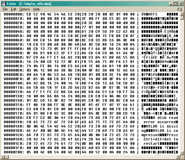 vypis, boot sektora, ktory som ti dal bol z novo formatovaneho disku, takze v ziadnom pripade nejde o systemovy disk, ja naozaj neviem o co ti ide, mas tam presne ten kod, ktory je zodpovedny za volanie NTLDR,t.j. ked sa z novo formatovaneho disku pokusis bootovat, dostanes znamu hlasku NTLDR is missing pretoze sa na nom nenachadza NTLDR ale kludne nan mozes prekopirovat obsah ineho systemoveho disku a win nabehne