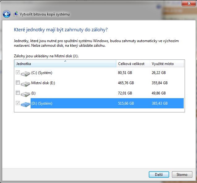 Jenze ted chci udelat novou bit. kopii a po kliknuti na nabidku vytvorit bitovou kopii je vse ok. Pak se v dalsim okne vybira misto, kam chci zalohu ulozit, to je taky ok. Jenze pak po prejiti do dalsiho okna, kde se vybira disk do ktereho chci udelat bitovou kopii a tam to ukazuje na problem. Uz nemam moznost vyberu disku, respektive tam je, ale je zasedla a neaktivni. Win se nejak rozhodly, ze potrebuji zazalohovat i disk D, kde mam asi 400GB dat a zadnym zpusobem jsem neprisel na zpusob, kde a jak z toho okna bitove kopie odstranit disk D. Prosel jsem napovedu a nic jsem nenasel. Na notebooku jsem zkusil to same. Tzn., ze uz na pc byla jednou vytvorena bitova kopie systemu a ted pri vyberu nove bitove kopie to bez problemu zalohuje pouze system C. Nevite nekdo, kde muze byt problem a proc se win na jednom pc rozhodl, ze potrebuje k fungovani, jak sam pise i bitovou kopii disku D?