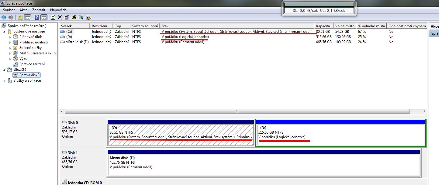 HDD je porad stejny, rozdeleny na C a D. C je system, aktivni, primarni. D je logicky. Takze s HDD jeho oddily jsem vubec nehybal. Pri prvni zaloze to umoznilo udelat bitovou kopii pouze disku C, takze jsem byl spokojen.