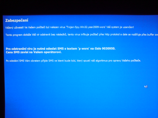 Dobrej,zase mám problém,znovu se obracím na vás,protože už nevím jak dál.Při instalaci(nejspíš)se mi dostal do PC vir,když restartuji Pc nebo vypnu a znovu zapnu naběhne vše ok,pak ale se objeví trojúhelník s vykřičníkem a naskočí tato hláška.(přiložený obr.)Počítač jsem projel Avastem,,Spyware terminátorem,on-line Esetem našli se nějaké viry většinou Win 32 trojan,Antivir je odstranil a při další kontrole nic nenašel,stále se mi to vrací po zapnutí na tu hlášku,je tam dodatek že mám ještě 4krát možnost zapnutí pc a pak se zablokuje.Nevím jestli mám poslat sms aby to pak nebylo horší.Není tam poskytovatel cena no prostě mám strach o data v Pc.Prosím o radu,nemá někdo zkušenosti?Co mám tedy dělat?Děkuji za pomoc.
