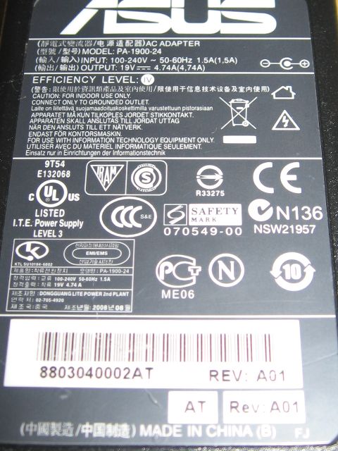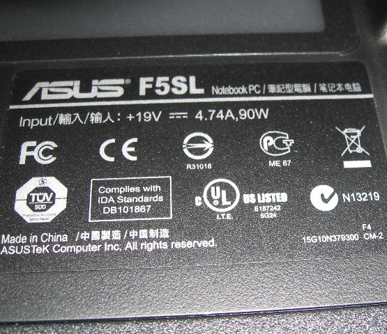 Ten werk (notebook) má zespodu typový štítek s údaji o napájecích parametrech.
