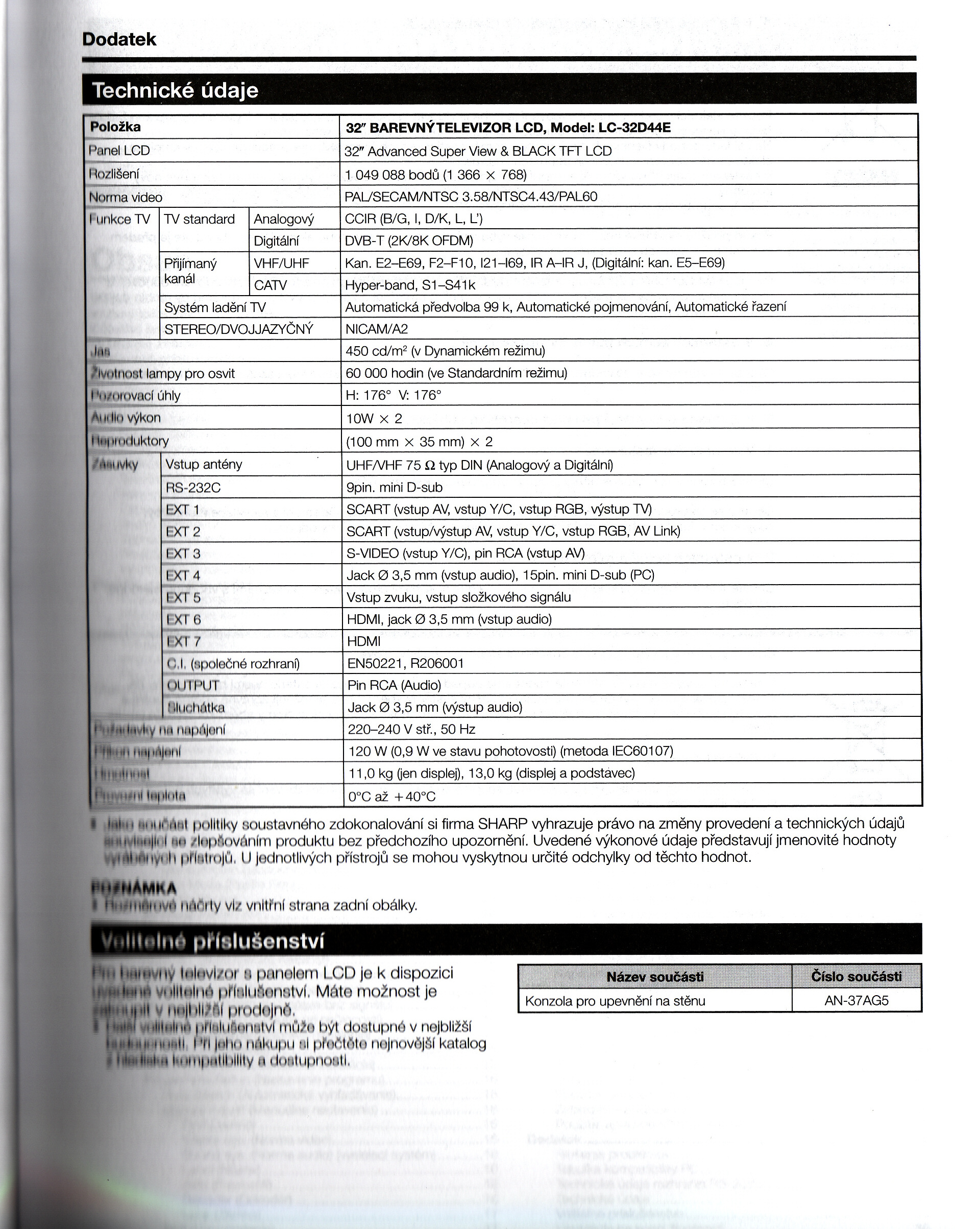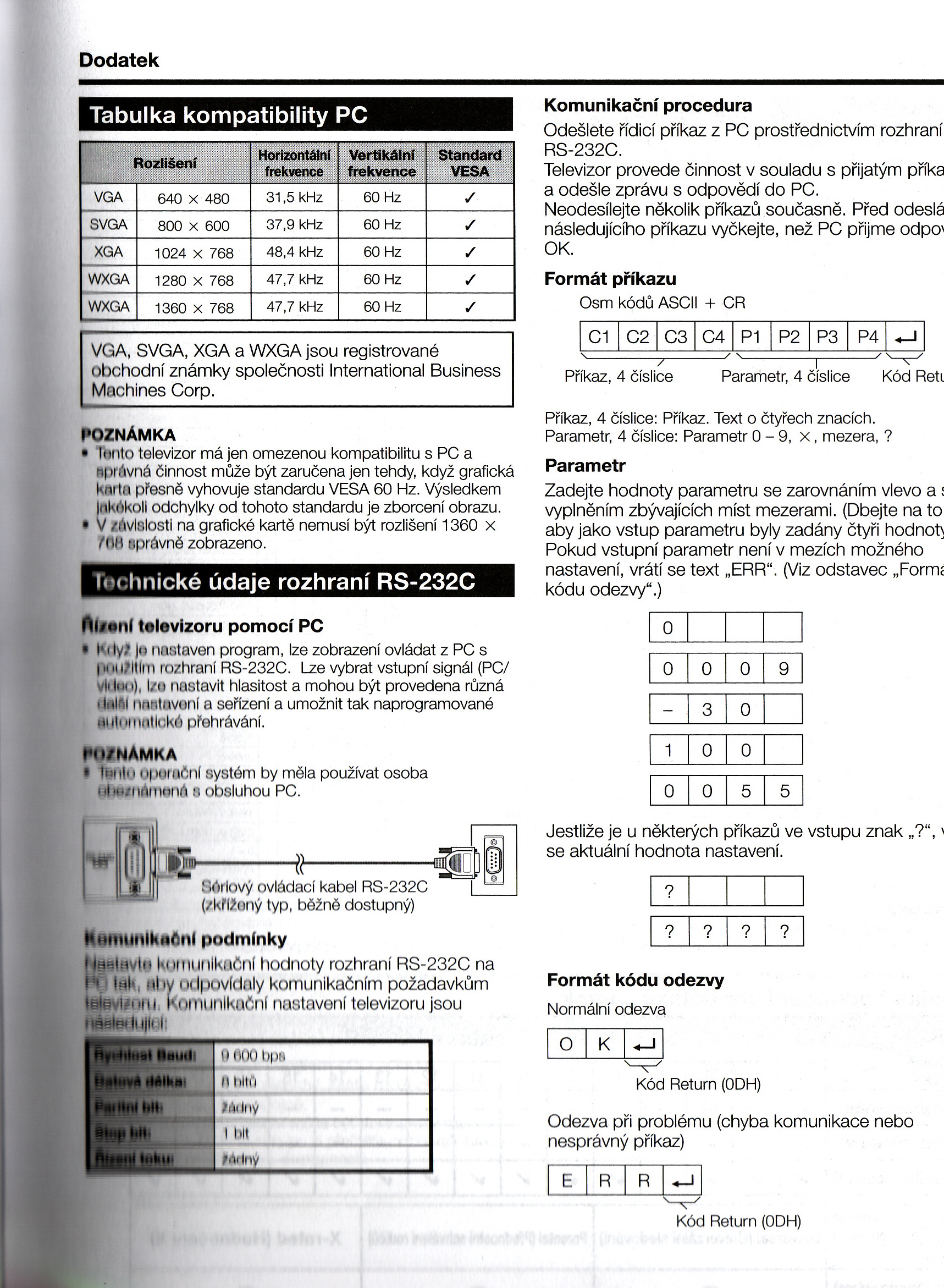 V návodu je nějaká tabulka kompatibility PC a je tu napsáno, že tato TV má jen omezenou kompatibilitu s PC a správná činnost může být zaručena jen tehdy, když grafická karta přesně vyhovuje standardu VESA 60 Hz. Pak je tu něco psáno o rozhraní RS-232C a tabulka s technickými údaji. Mám popsat něco z toho konkrétněji?