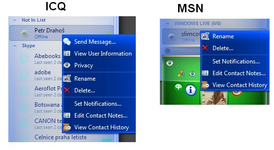 Ja tu moznost o ktorej pisal Kurt mam len pri kontaktoch pri ktorych sa mi nezobrazuje status, mam taky len jeden, ICQ system, ten sa neodporuca mazat, pri MSN nemam nikoho takeho. Inak vlastne tato moznost nema opodstatnenie, preto tam nie je. Preto odporucam vymazat sa navzajom, na oboch stranach. Mne to islo skoro vzdy, parkrat bol problem pri ludoch ktori museli preinstalovat OS, ale napravilo sa to hned.