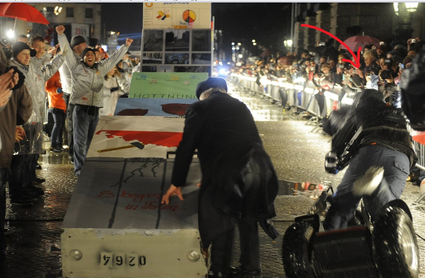 Jinak na fotografii shazuje obří domino z polystyrenových kvádrů někdejší vůdce Solidarity Lecha Walesa k 20. výročí pádu berlínské zdi.