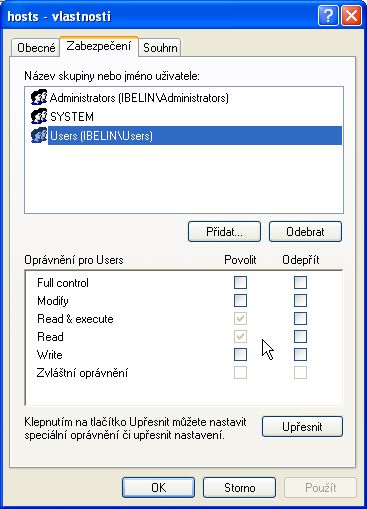 Tak zkus radši napřed to co ti radí Kmochna - nastavit práva jen na soubor hosts.