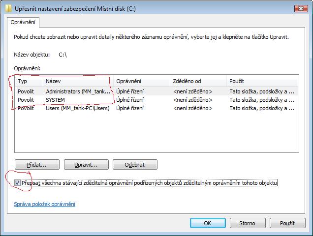 pokud to nepomůže zkus ještě definovat kdo na disk může šahat.To je to nebezpečný. Musí tam být system, administrators a já dávám ještě users Všimni si že Administrator a Administrators není to samý! Dole zaškrtnout přepsat všechna...Nastav úplné řízení. Pokud je tam něco navíc než ti tři typicky s otazníkem tak to vymaž.
