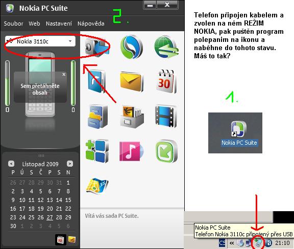 Pripoj foun k PC, otevri PC Suite poklepanim na ikonku s krizkem, pote vyber spravce spojeni, postupuj dale podle pokynu, pak pisni co to hlasi, pokud se to takto tvari pri propojenem telefonu a mas li zvolen rezim telefon, pak to vidim ze system nerozpoznal nebo nejsou instalovany USB drivery. Sice je tu screen, ale ten mi nic nerika. Pripadne se podivej tady: http://europe.nokia.com/get-support-and-software/d ownload-software/cable-drivers Jo a kabl pouzivas jaky? Je original nebo nahrada?