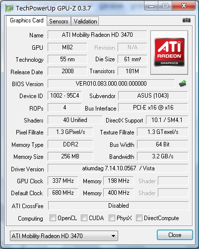 mám tu notebook s GK ATI Mobility Radeon HD 3470, která má nízké frekvence GPU Clock (337MHz) a Memory (198MHz), přitom takto z výroby nataktovaná není: