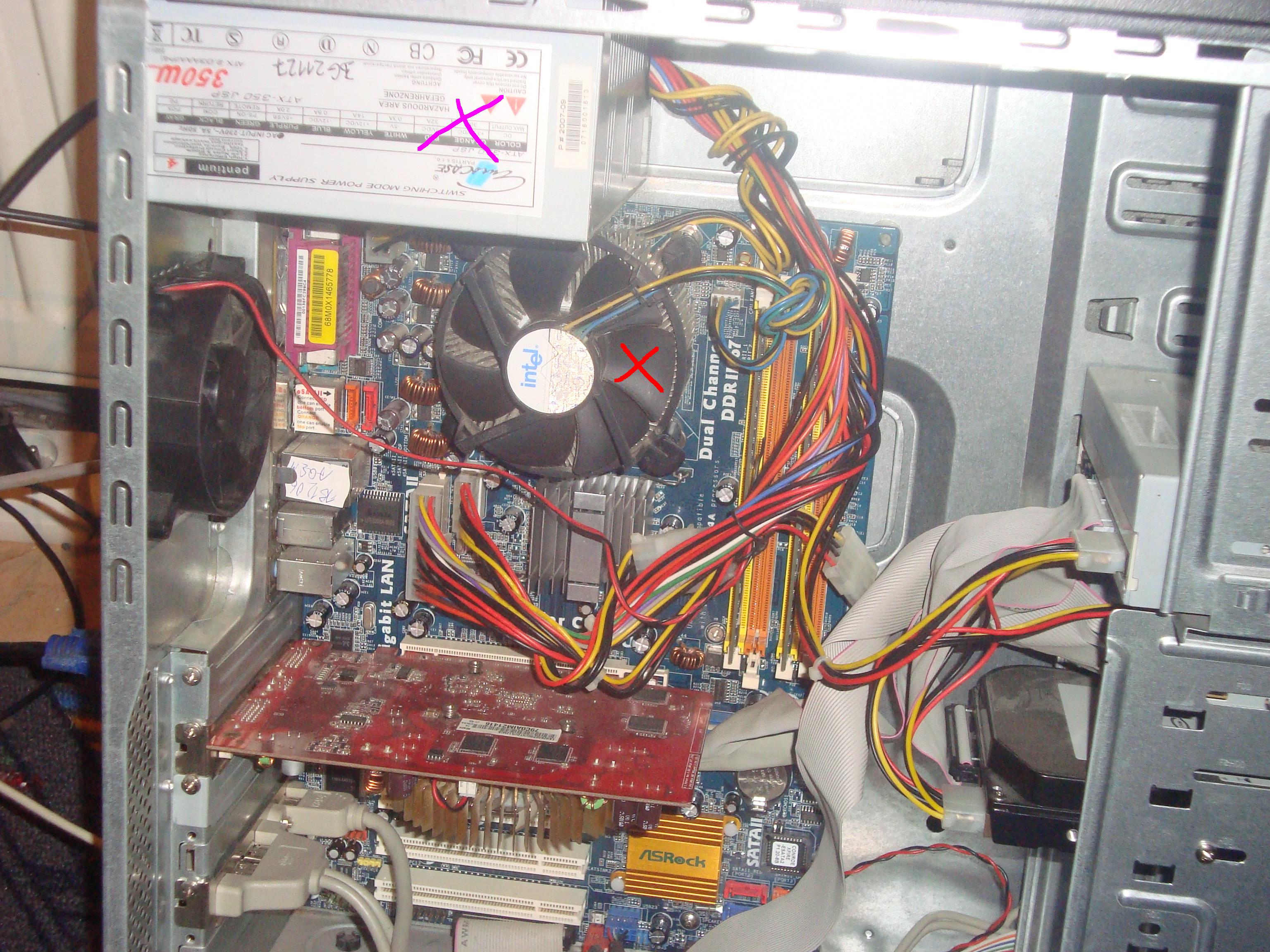 pod červeným ventilátorem je procesor. tvůj větrák má napsané "intel" - je to originálně dodávaný levný krám, už má nejlepší léta za sebou. teoreticky jde kamsi do ložiska kápnout olej - nikdy jsem nedělal.