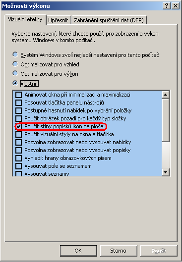 Mrkni na muj stary thread http://pc.poradna.net/q/view/455472-jak-na-transpa rentni-pozadi-ikon-na-plose-wxp-prof a odpovedi na nej, tady ale bylo nutne reinstalovat system. Jestli ti nepomuze vyse zminene nastaveni vykonu, ozer se a reinstaluj (anebo spis opacne