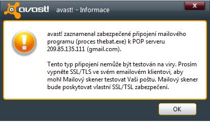 Mluvime o pripojeni pres SSL, napr. k GMailu, kdy jsou zpravy sifrovane mezi serverem a klientem a Avast si prudi tim, ze je nemuze zkontrolovat.