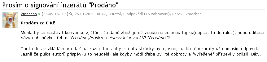 No jo ale podle ceho to chce zjistit, z textu? Nebo snad poctem odpovedi ve vlakne? Spis by to mozna chtelo nakou znacku do vlakna jako cas treba, po uplynuti doby aby bylo zrejme ze se to prodalo. Tez upozornit navstevniky.