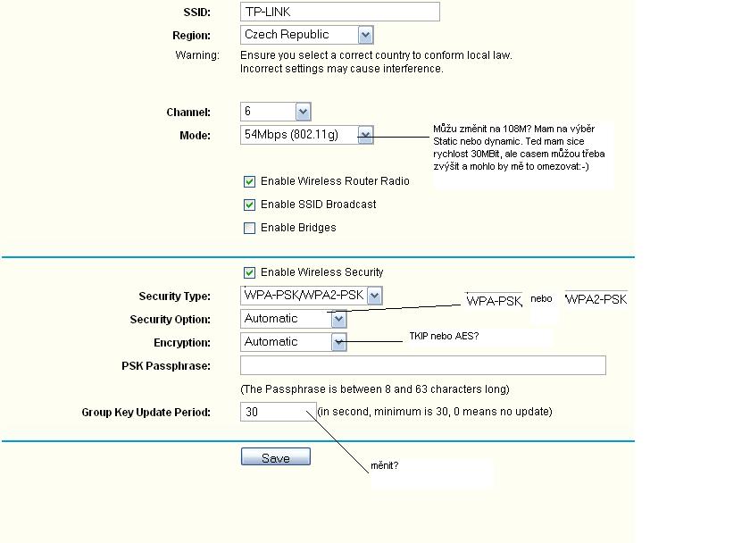 Já zrovna moc síťař nejsem, takže si netroufám moc radit. Zezačátku bych jen změnil SSID na nějaké srozumitelné jméno (to uvidí notebooky jako název sítě), nastavil TKIP a dopsal heslo. Třeba někdo poradí vhodnější nastavení ostatních věcí, ale i při tomhle nastavení by to mělo fungovat.