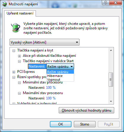 Bohužel jsem to ve "vlastnosti obrazovky / sporic / vlastnosti napajeni nebo pres ovladaci panel" nenašel. A uvedená adresa se nevztahuje na můj OS, to jsem se dočetl přímo na dané stránce:"
