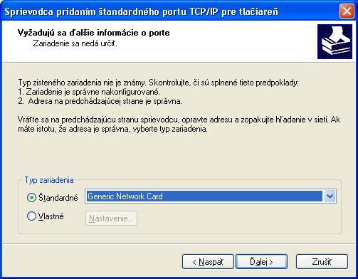 Som admin. postupujem nasledovne: vsetko zapojene ako ma byt, pridavam tlaciaren. TCP/IP port, dam cislo ktore som obdrzal po vytlaceni testpage a v dalsom kroku mi napise ze zariadenie sa nenaslo.