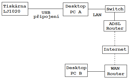 rád bych ze svého PC (na obrázku níže označeno jako PC B) tisknul na jiný PC (PC A), který má na USB připojenou tiskárnu. Oba PC mají IP 192.168.1.XXX a jsou za routery, oba routery mají veřejnou IP. K oběma PC mám administrátorský účet. PC B používá Vistu Home premium, PC A používá XP home.