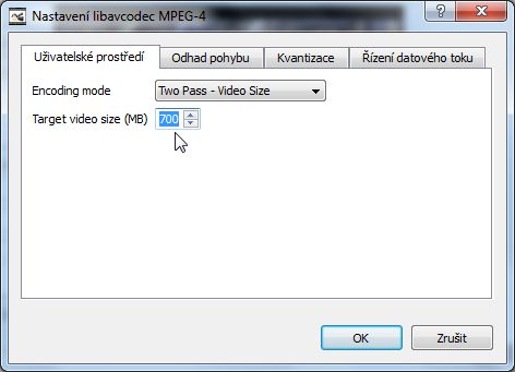 Nastavení Mpeg4-4 ASP (lavc) na velikost video stopy s parametrem velikost souboru: