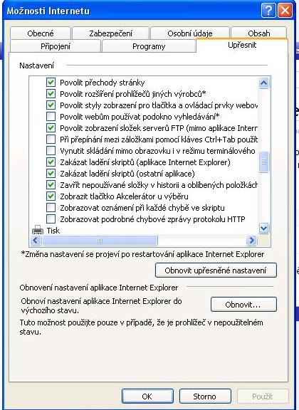 Klepněte na kartu Upřesnit, zaškrtněte políčka Zakázat ladění skriptů (aplikace Internet Explorer) a Zakázat ladění skriptů (ostatní aplikace).