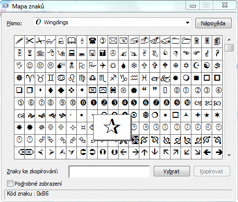 V mape znakov zvolit pismo "Wingdings" (kod znaku: 0xB6).