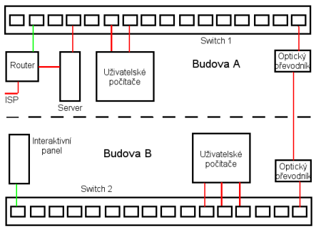 Zdravím a potřebuju poradit. Místní škola zařizuje informační tabuli, která by měla být propojená s internetem. Firma, která ji instaluje, by ji měla krmit daty vzdáleně. Problém je v tom, že se nedaří s tabulí spojit, když je propojená ve školní síti a Autocont (který provozuje server a vše ostatní) se k rozchození staví velmi laxně. Schéma sítě je na obrázku, jsou to dvě budovy propojené optikou a vzdálené od sebe asi 200m. Router je v jedné budově, tabule ve druhé. Protažení zvláštní linky nepřichází v úvahu. Na routeru funguje DHCP, na serveru běží ISA server. Pokud na volný port routeru připojím počítač, dostanu jinou IP, než má vnitřní síť a můžu na net. Bude fungovat zeleně vyznačená cesta?