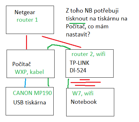 Chtělo by to asi podrobnější popis jak je to s internetovým připojením a proč je nutný router 2. Jinak by samozřejmě bylo nejlepší vše zapojit do router 1. Tiskárnu je třeba nasdílet. Taky je třeba zjistit, zda pro danou tiskárnu existuje ovladač pro daný typ W7. Nedávno jsem bohužel u jedné Canon tiskárny narazil na to, že ovladače pro W7 64-bit nemají a mít ani nebudou (pro W7 32-bit je mají).