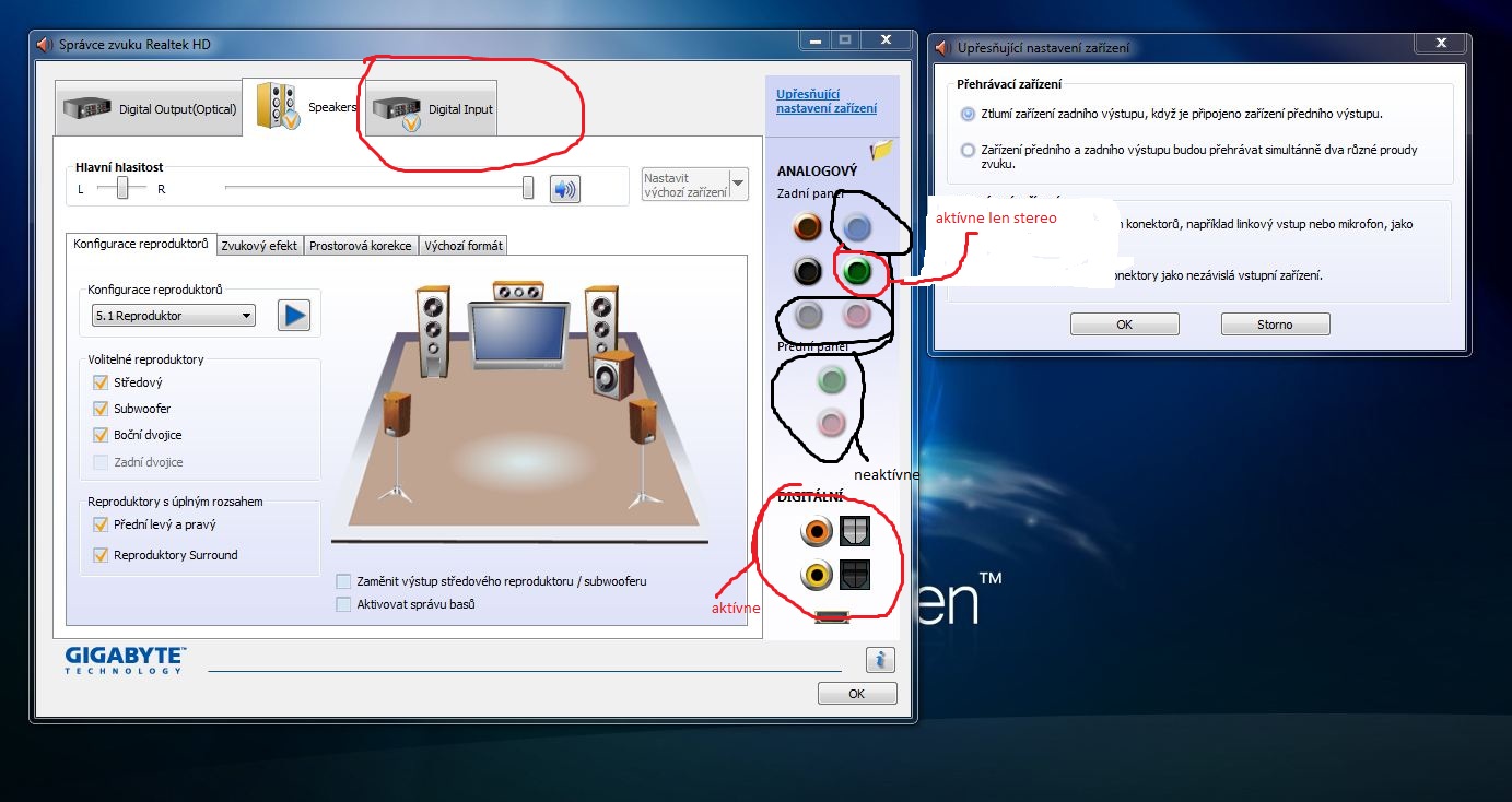 máš tam zapnutý digitálny vstup,takže na analogu súčasne nijako nedostaneš 5.1 zvuk[integrovaný realtek na to nemá potrebný hardware],ten ide ,pokial je aktívny niektorý digitálny vstup/výstup len ako výlučne s/pdif pass trough signál cez digitálny vstup/výstup,na analogu je len stereo "odposluch" z prvých dvoch kanálov integrovaného realtek-čipu ,pomocou ktorých je pripojený na čipset zákl.dosky