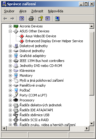 Ve správci zařízení byly ještě dvě bezkonflikní položky ASUS (motherboard i GK 8800 jsou asusácké). Po jejím zakázání a restartu konečně šly ovladače grafiky z CD korektně nainstalovat.