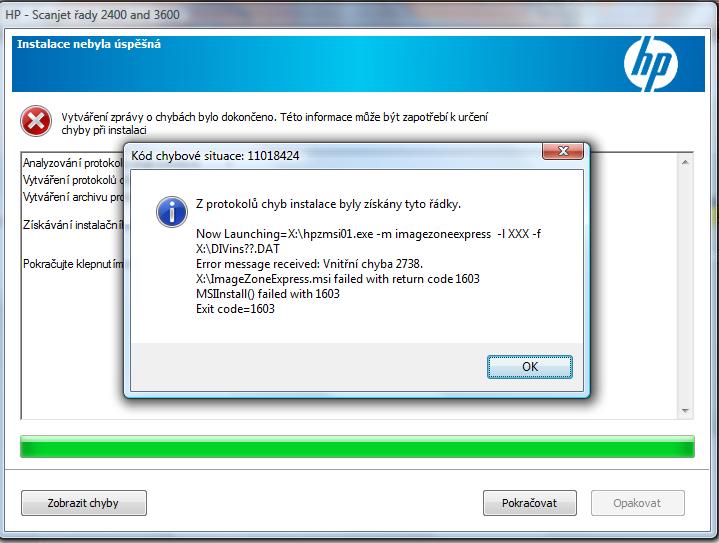 Chyba při instalaci softwaru pro scanner