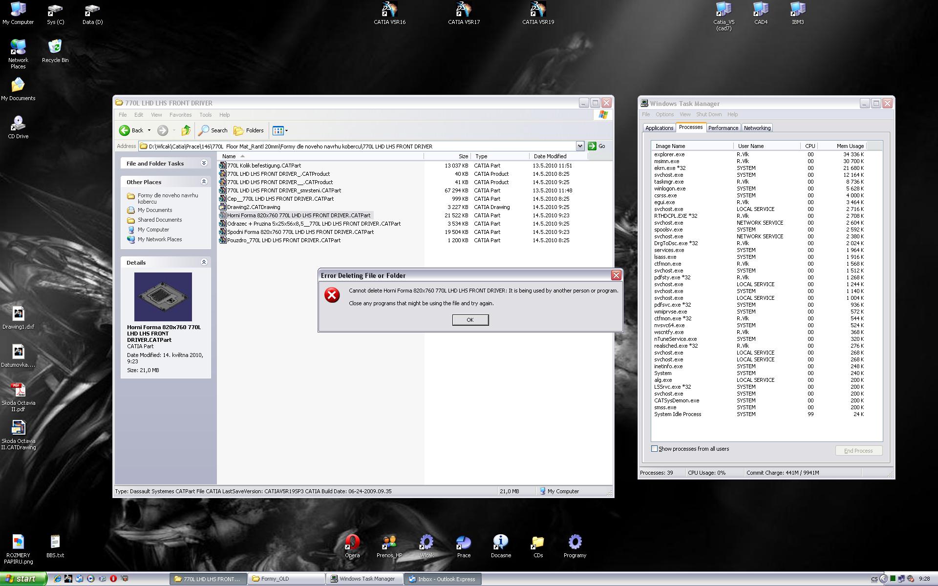 Mám dotaz ohledně chyby při mazání souboru ve Win XP prof SP2 x64. Poslední dobou se mi hodně často stává že když chci smazat nějaký 3D model nebo výkres tak mi to hodí hlášku která je na jpg, pokud však otevřu složku v programu IZArc(podobný jako WinRar) a smažu to z ní, je vše OK Používám program Catia V5 a ikdyž není spuštěná a v procesech neběží někdy to prostě nejde.. Samozřejmě že když mám daný soubor otevřeny tak to hodí tuto hlášku ale nyní to děla i když je vše zavřené a Catia zaplá není. (zkoušel jsem to i když byl PC vyplý a hned po startu kdy nebyla ani Catia v daný den spuštěna ale stále to nešlo.) Může to být způsobeno náhledy? (vypínat je by byl celkem problém jelikož když by sem se chtěl na nějaký soubor podívat tak by jsem musel otvírat Catii což je zdlouhavé, a teď mi zcela vyhovují náhledy)