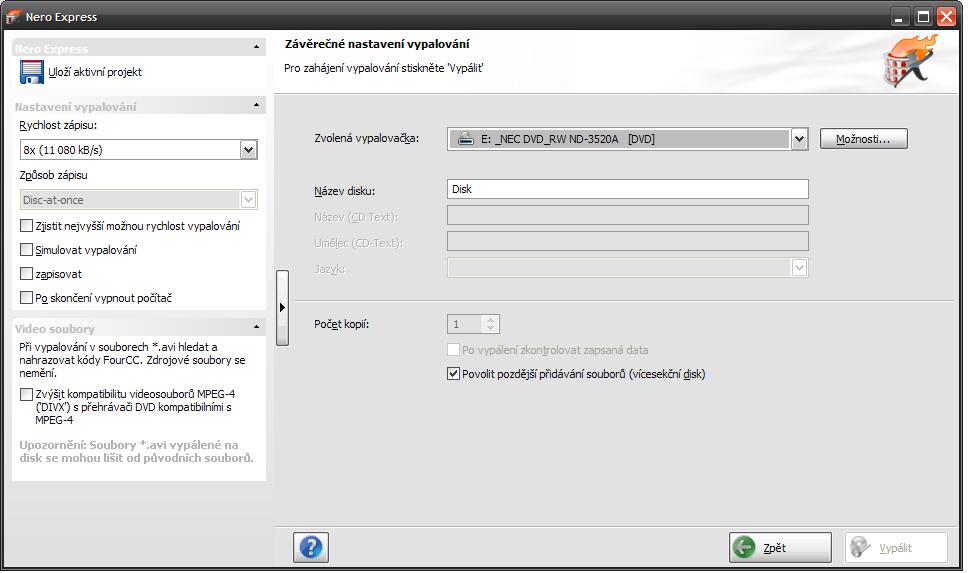 Dneska jsem chtel vypalit malemu synovcovi Teletubies 2x cca 700MB (641 a 750MB) na DVD... Klasicky jsem dal do mechaniky DVD-R 16x a zvolil NERO Expres a Datove DVD (jak to delam standartne) po pridani souboru a zahajeni vypalovani vyskoci okno s chybou viz. jpg.. Ikdyz sem snizil rychlost zapisu na 4x tk furt to same a ikdyz sem odskrknul povolit pozdejsi pridavani tak se take nic nezmenilo.. nevite cim to muze byt?
