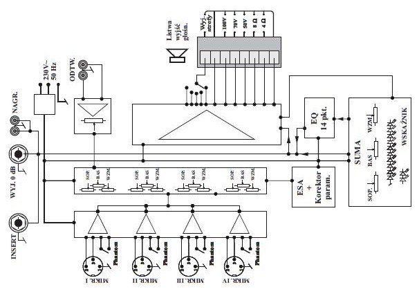 Já nejsem hudebník a polsky neumím. Ale podle mě je to mono zesilovač "do racku" s výstupním napětím 50-100voltů (do rozhlasové ústředny např.) a jediný co se k němu dá připojit je x mikrofonů. Jak k tomu ty repra připojíš tak buď odejdou repráky nebo zesák nebo oboje.