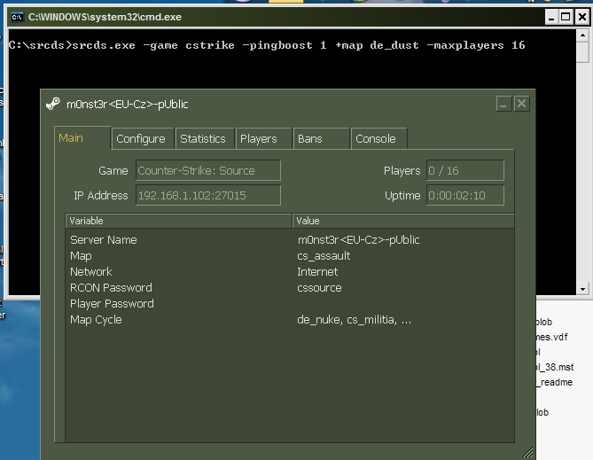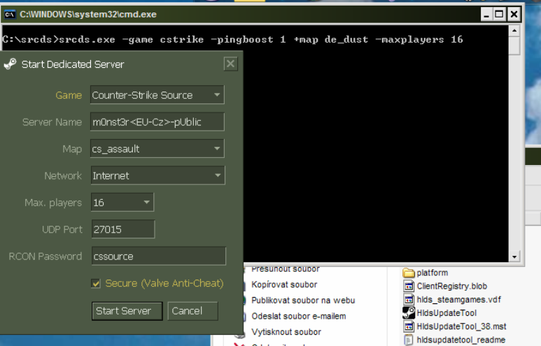 Vidim tam 2 problemy, prva je, ze server ma privatnu ip a na tu sa cez net nepripojis ak nemas spraveny portforwarding z routra s verejnou ip alebo nastavenu DMZ na danu ip. Druha je, ze hra nepresla steam validaciou, cize je najpravdepodobnejsie kradnuta a tym padom ti nedovoli vytvorit server.
