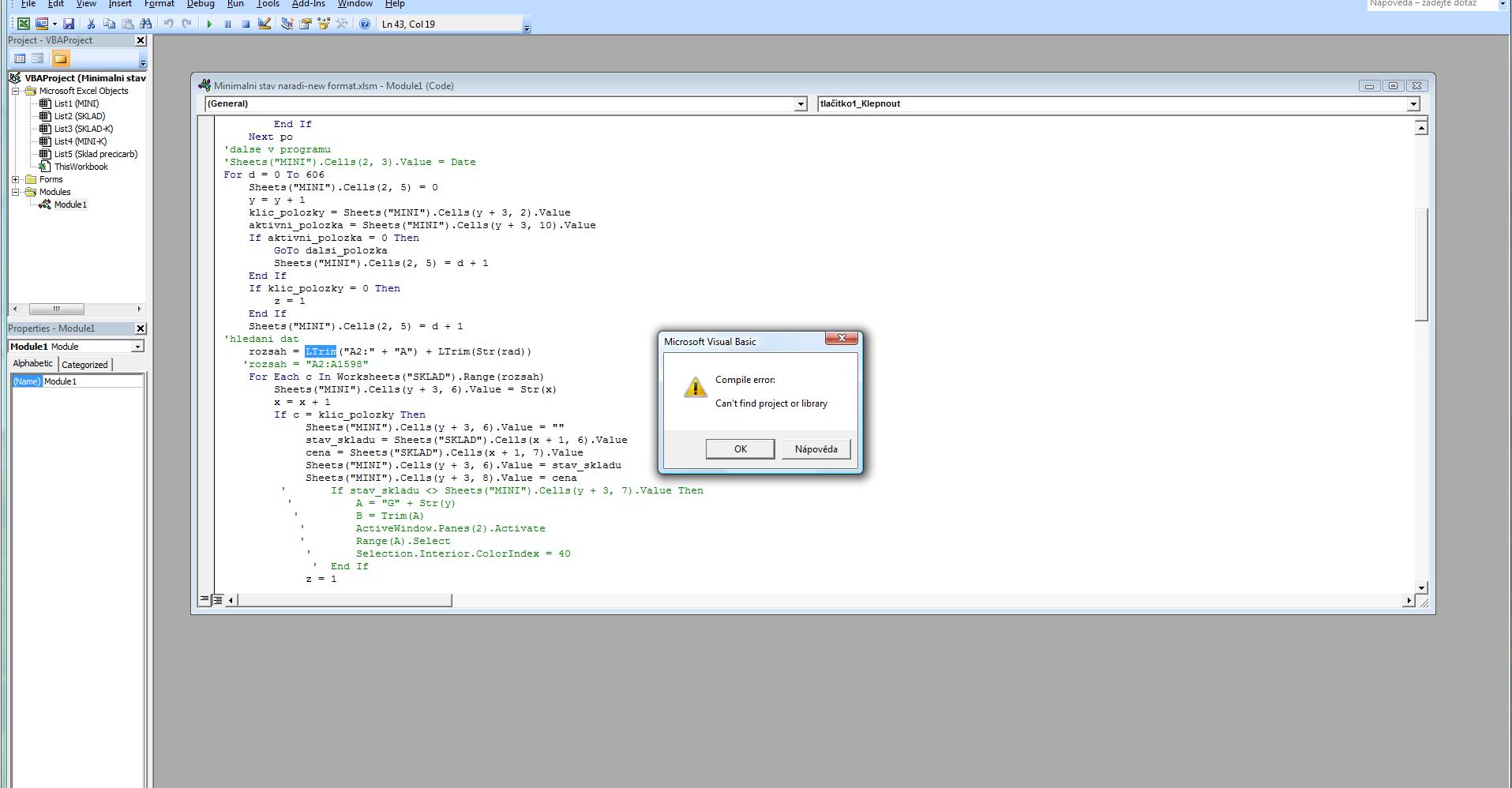 mám menší problém s excelem a jedním makrem. Makro slouží ke kontrole poctu kusu ve skladu. Drive jelo na WIN XP a ted se daval novy PC a jsou tam WIN 7. a makro nejde spustit. chodi hlasku kterou prikladam jako obrazek. Je to tim, ze nema spravne zadanou cestu nebo chybi nejaka knihovna? prosim o radu. diky.