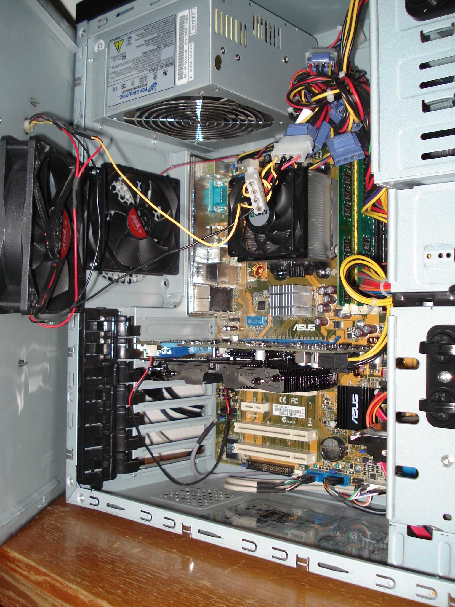 protože ti ten bočnicový větrák dělá svým proudem vzduchu clonu. Toto umístění ventilátoru je vhodné pro windtunnel na CPU, ale pokud jen takto fukuje desku, tak se musí ta pasivní grafika doslova "vařit ve vlastní šťávě". Správné umístění tlačného (do bedny foukajícího) ventilátoru je zepředu dole (před košem na disky)