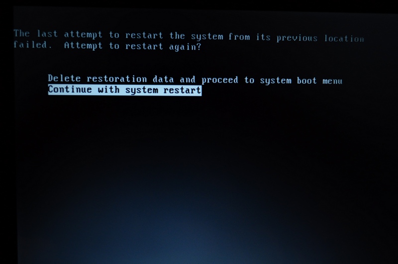 Ta první volba znamená "Odstranit obnovovací data a spustit systém". Co se stane, když ji použiješ? Obvykle tahle situace nastává, pokud je nějak poškozený soubor hiberfil.sys. A to může být i vadným harddiskem.