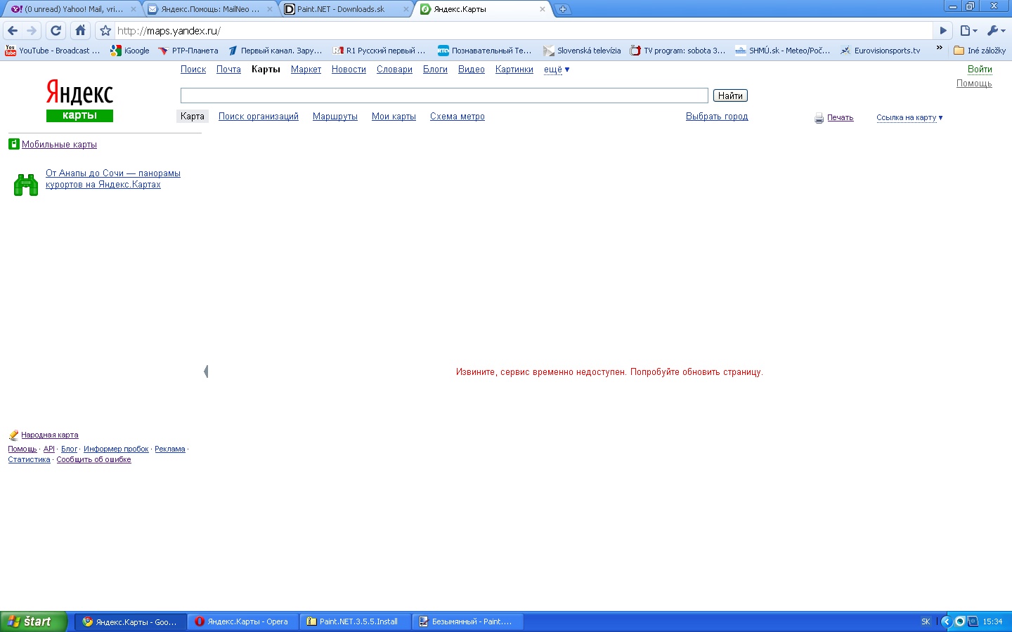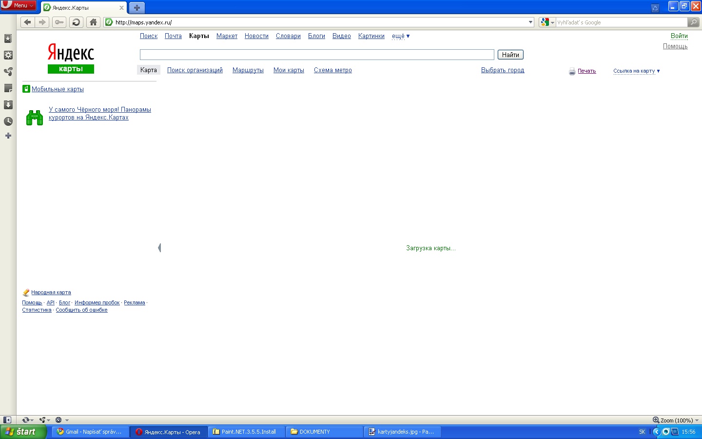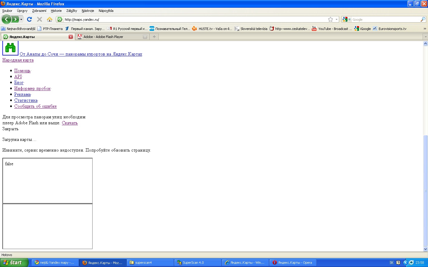 Nejde mi zobrazenie máp na yandexe - maps.yandex.ru. Skúšal som rôzne prehliadače (najnovšie verzie ie8, chrome, mozilla) - na mieste mapy sa zobrazí iba ruský text (v preklade: servis je dočasne nedostupný, skúste obnoviť stranu). V Opere sa zobrazí ruský text - načítavanie mapy. Mapa sa nezobrazí. Problém vznikol okolo 20.7.2010, dovtedy všetko fungovalo. Obnovenie systému nepomohlo. Dočasné vypnutie firewalu ani vymazanie cookies nepomohlo. Google mapy pritom idú normálne. Mám XP, ESET. V čom je problém? Ďakujem pekne za odpoveď.