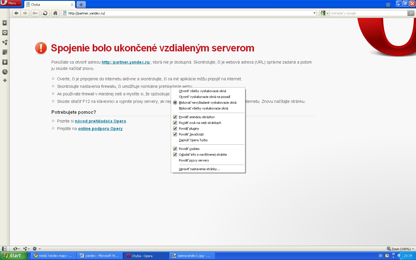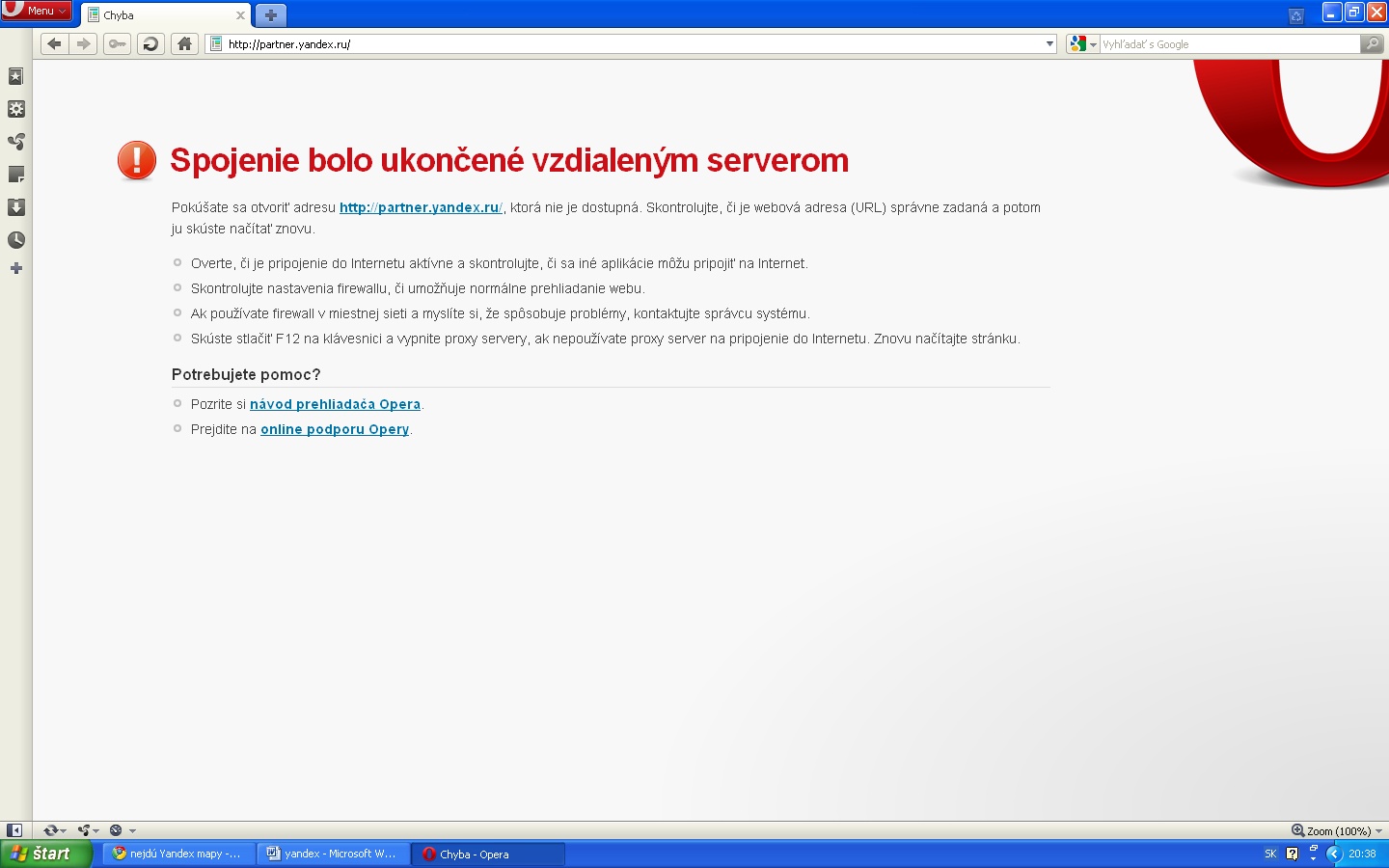 Čo sa týka proxy serverov, na stránke partner.yandex.ru mi vyhodilo chybové hlásenie o ukončení spojenia vzdialeným serverom, pričom ako jednu z možností mi ponúkli cez F12 vypnúť proxy servery - no ja ich nemám vôbec zaškrtnuté (a ani sa táto položka nedá zaškrtnúť).