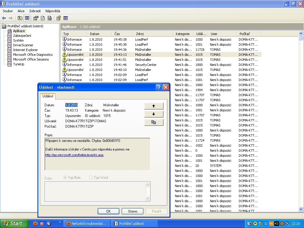 ten msi instaler v prohlížeči událostí hlásí co za chyby?