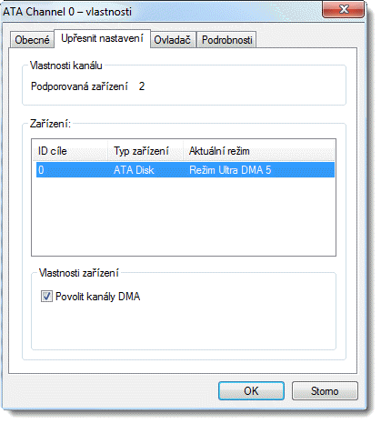 Jak už jsem napsal, disk je SATA a správce SATA kanálu nemá položku "upřesnit nastavení" a nenašel jsem nikde možnost, kromě biosu, nastavit DMA přenos.