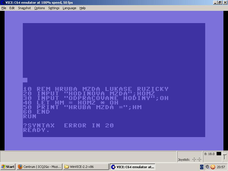 To byly stroje dřív,no jinak opět chyba,dneska sem zkoušel jinej návod a pořád to hazí syntax error u 20. řádku,dělám to zatím podle knížky,ale zkoušel sem místo středníku : i , a nic.