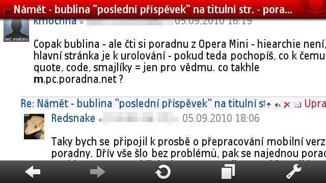 Copak bublina - ale čti si poradnu z Opera Mini - hiearchie není, hlavní stránka je k urolování - pokud teda pochopíš, co k čemu je, quote, code, smajlíky = jen pro vědmu. co takhle m.pc.poradna.net ?