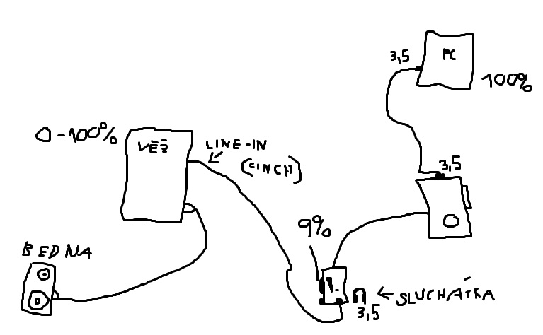 K problému: Zvuk funguje dle představ, ovšem pokud dám zvuk ze zvukové karty více, než 15% tak začne zvuk praskat a chrchlat. Když mám zvuk pod 15% tak vše funguje jak má. Pokud ale zvednu na hi-fi hlasitost-zvuk začne šumět ale hraje to dobře bez zkreslení. Napojil jsem to tedy takhle-viz foto. Tato to funguje stejně jako ze zvukové karty-dám více na ovladači u 2.1beden a zvuk začne chrchlat. Má to ovšem výhodu, že můžu mít PC na 100% a jen mít stálou hlasitost u 2.1 beden.