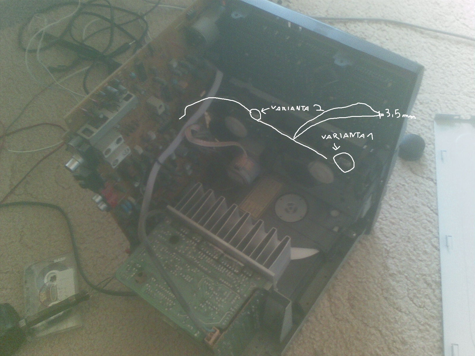 Tak jsem si rozhodil.... omlouvám se za kvalitu fotek, ale fotak nemam:( dostal jsem napad vyvest do zesilovace zvuk misto kazet napojením na dratky z kazet (ktere stejne nefungují) nakreslím na přiložené fotky jak myslím.