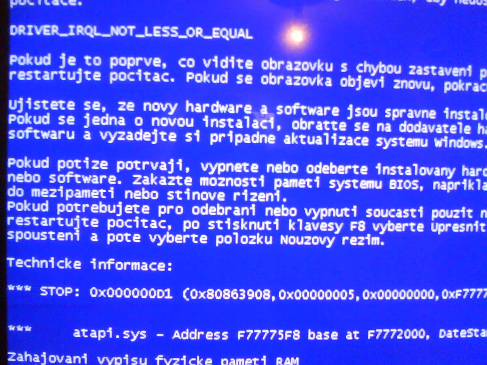 Dorbý den , dnes jsem instaloval na svůj pc windows XP SP2. Nabootoval sem cd , zformátoval hdd no a začali se kopírovat soubory , po zkopírování souborů to chtělo restartovat PC ,tak sem restartoval a nastavil bootování z hdd. Do té dobry bylo všecko v pořádku ,ale pak když ta instalace pokračovala ,tak mi naskočila modrá obrazovka - viz. přiložený obrázek. Nemáte někdo nějaké rady čím by to mohlo být způsobeno? Zkoušel jsem to znovu instalovat od začátku zase ,ale opět se ukázalo to samé. Děkuji za rady
