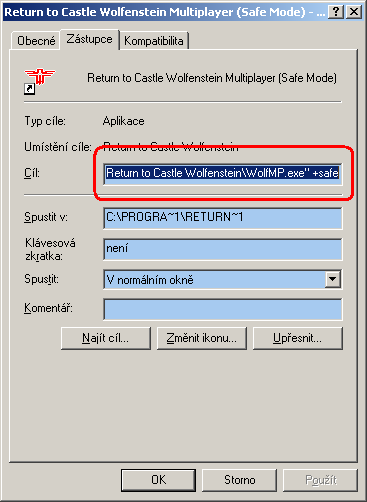 Musíš to v "cíli" napsat za uvozovky, tedy v tomto případě "C:\Program Files\Return to Castle Wolfenstein\WolfMP.exe" +safe