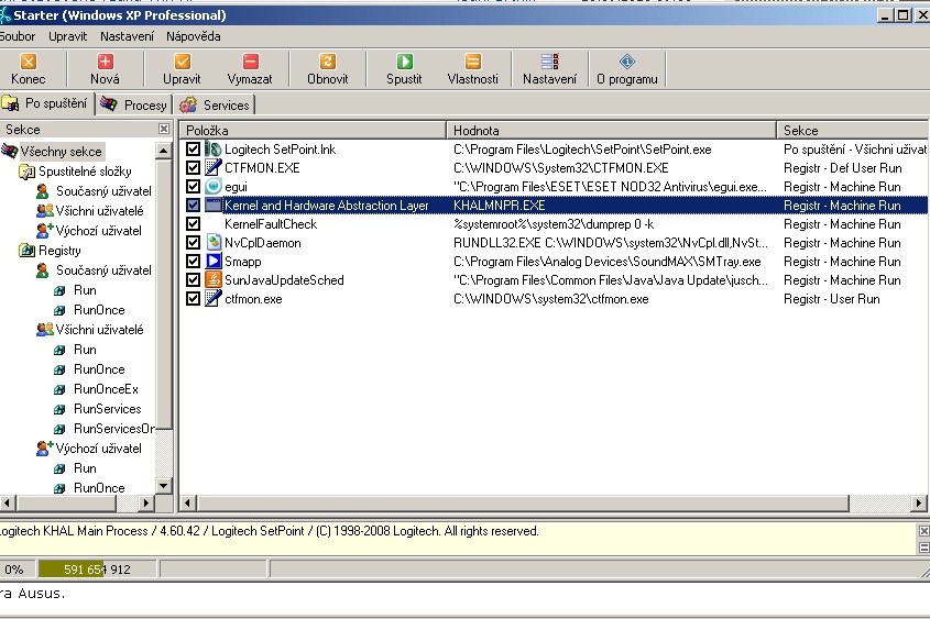 od logitechu ti toho běží nějak moc - cvičně bych odškrtnul khalmnpr.exe. jak má něco v názvu "hal" a není to od ms, jsem ve střehu.