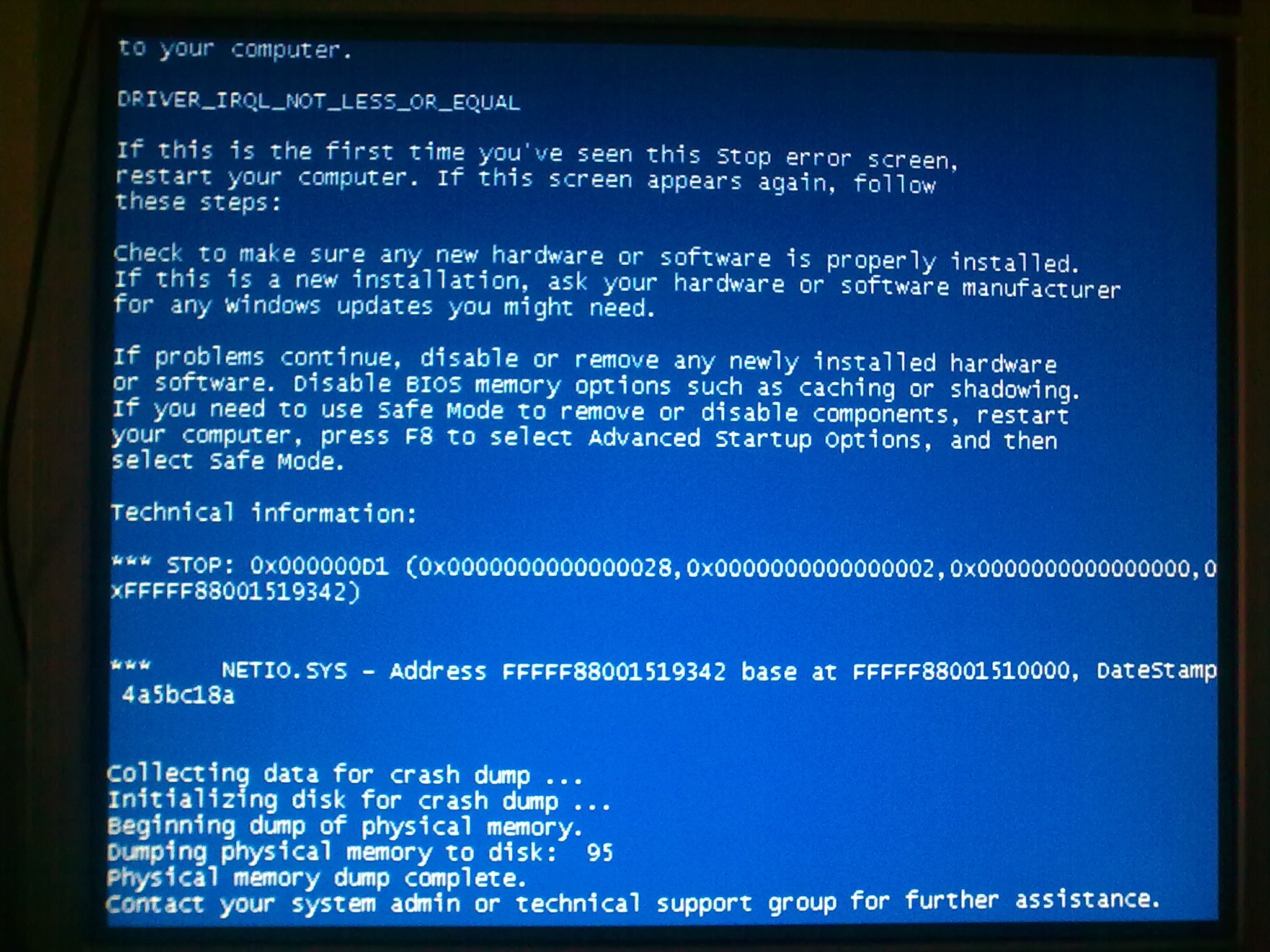 Řešení: Prohlédnout události ve správě PC a odtud se odvine další postup. Ve zprávě je i NETIO.sys - zkus nouzový režim bez práce v síti, popřípadě NR příkazový řádek a resetuj TCP/IP příkazem : netsh int ip reset