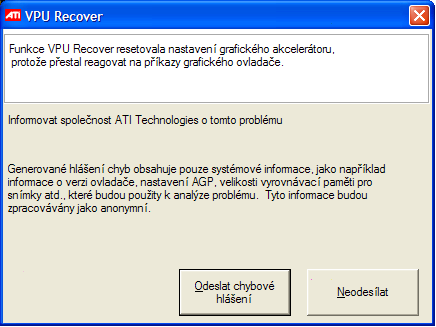 mám problém s GK. Mám ATI Radeon x1950 Pro a ATI Radeon X1950 Pro Secondary, a při hraní většiny her (včetně tech velmi starých- např. Rise of Nations) se mi hra tak po 2-3 minutách sekne a ukáže mi přiloženou chybu. V lepším případě hra spadne, v horším se mi pc restartuje.