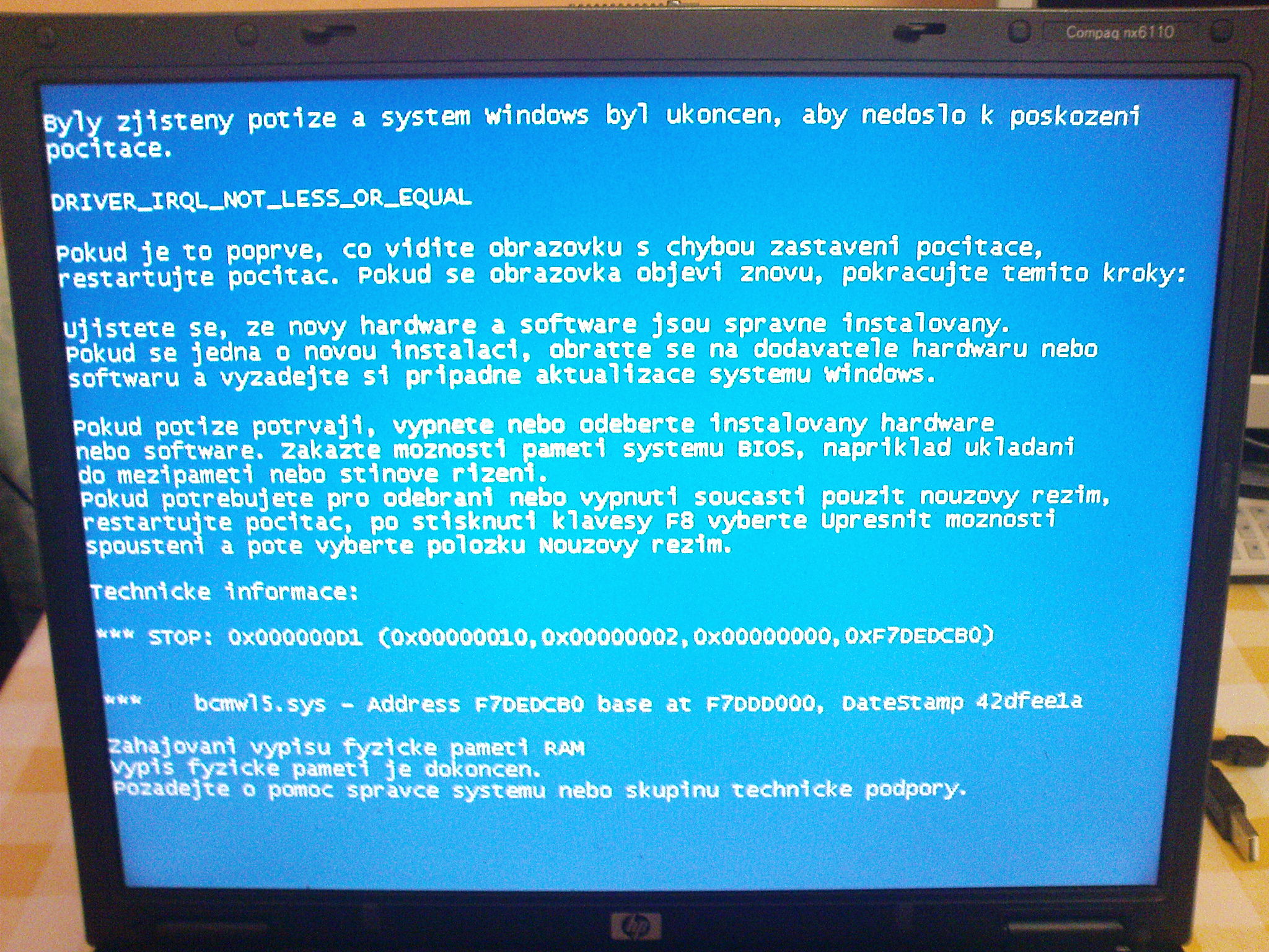 Zdravím, mám nebo snad měl jsem tentýž problém, na notebooku HP Compaq 6110, který používám 5 let a několikrát jsem na něm dělal během té doby čistou instalaci a vždycky to běželo stabilně, až nyní, kdy jsem se rozhodl že jej prodám, jsem opět chtěl udělat čistou instalaci, což ještě proběhlo v pořádku, ale jak jsem tam začal sáčkovat ovladače a došlo na ovladače wifi (Broadcom b/g) tak najednou přesně tahle modrá obrazovka a po cca dvou sekundách restart a takhle to pořád bylo v nekonečné smyčce, potom jsem vyzkoušel nouzový režim, to nějak najelo, ale stejně to stabilní nebylo. Protože ta hláška byla zobrazena jenom chvíli tak jsem si ji pořádně nemohl přečíst, ale vždycky jsem si všiml toho co je napsáno nahoře "IRQ NON LESS atd..." což ve mě evokovalo myšlenku že se jedná o konflikt IRQ přerušení, ale nevěděl jsem proč, když jsem to už tolikrát instaloval a vždycky to běželo v pořádku. Pak se mi to konečně podařilo vyfotit tu hlášku a zjistil jsem že je problém v souboru bcmwl5.sys kterej to vypisuje, na internetu kolem toho nějaký informace byly a i třeba tady, takže opravdu wifi je tím problémem. Dokonce i na ofic stránkách HP mají o tom zmínku a hned tam nabízejí aktuálnější ovladač pro tuhle wifi kartu, takže jsem to stáhl, nainstaloval a vypadá to stabilně. Hlavně mi to tuhle modrou obrazovku smrti házelo ve chvíli kdy win XP bootoval, nebo když jsem dal PC do režimu spánku a potom se to z něj po startu obnovovalo, nebo i z úsporného režimu. Že by se to restartovalo samo v rozjetých win XP tak to ne, spíše když nabíhaly. Takže zatím se to zdá stabilní, režim spánku i úsporný režim zatím fachá tak jak má, takže se uvidí, jestli to opravdu vyřešili pouze novější ovladače. Sorry za tenhle referát, ale třeba se to bude hodit někomu, kdo se dostane přesně k tomuhle problému a tak už bude vědět čeho se to týká.